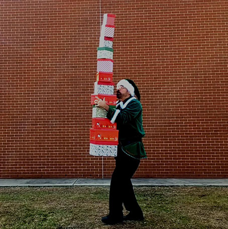 This crazy elf is carrying way too many packages. They look like they could fall any minute. Even though the packages wobble back and forth, they never fall. Everyone will laugh every time he almost drops them.