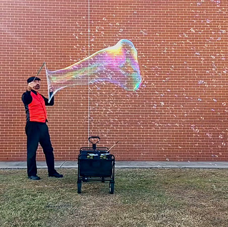 The Bubble Wagon is a smaller, more portable version of the Professor Pop Bubble Show. It has two bubble machines that work constantly, and Brett will amaze everyone with giant bubbles.